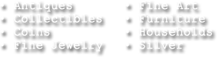 • Antique & Modern Furnishings • Architectural Antiques • Art Glass • Art Pottery • Coins • Collectibles • Crystal • Fine Art |